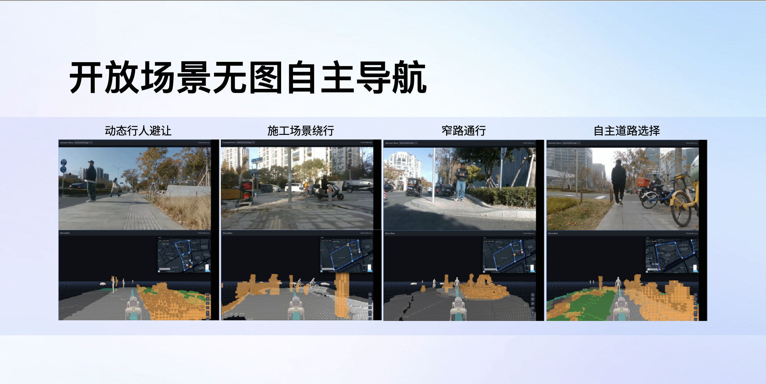 无论是动态行人避障、窄路通行,还是人车混流等复杂场景,搭载模组A1 的机器人都能从容应对。同时,模型支持通过强化学习持续迭代训练,随着应用场景的拓展,导航能力将不断进化,逐步适配更多未曾见过的复杂场景。