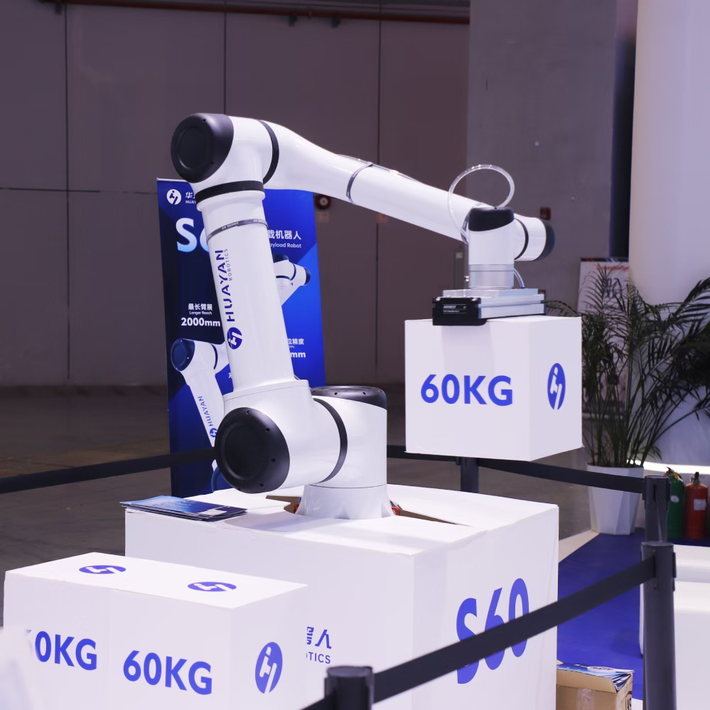 华沿S60大负载机器人臂展2米、负载能力高达60KG,搭载华沿自主研发的大扭矩无框力矩电机,融合电机与关节一体化设计,可长时间高负荷稳定运行。末端工具运行速度达到6.4m/s,尤其适用于码垛、搬运搬运、上下料等对负载与速度均有高要求的场景。