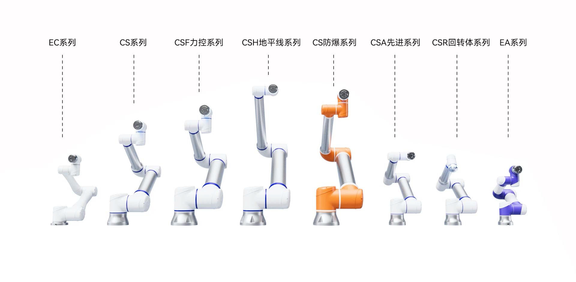 艾利特协作机器人包括稳定可靠的 ES 系列、性能卓越的 CS 系列、力控型 CSF 系列、先进的 CSA 系列、CSH 地平线系列、防爆型 CS 系列,以及 LS 系列。产品涵盖 5 轴和 6 轴协作机器人,工作范围覆盖 624mm 至 2000mm。