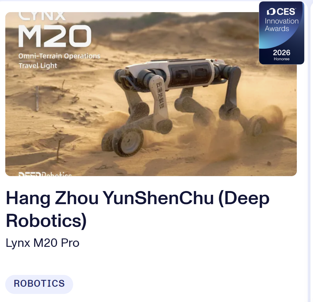 CES 2026创新奖由美国消费技术协会(CTA)组织,经行业专家、设计师和技术专家组成的评审团,从技术创新、设计美学、用户体验等多维度对参赛产品进行严格评估。云深处科技的山猫M20轮足机器人凭借优越性能与强大的极端环境适应能力,展现出技术稀缺性,在获奖率不足10%的激烈竞争中脱颖而出, 荣获CES 2026创新奖! 不仅体现了全球行业的前沿趋势,也代表了机器人领域的顶尖水平。