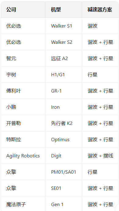 据公开资料统计,谐波关节模组和行星关节模组的组合在人形机器人上较为常见。