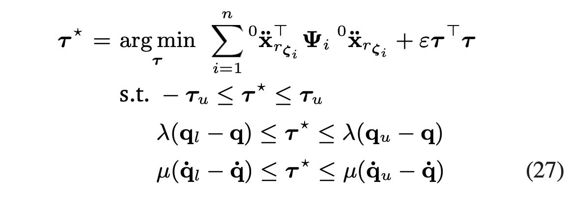 式中,0Wj ∈ Rm为施加在接触点j的外部 wrench;Λd , Dd , Kd ∈ Rm×m分别为期望惯性矩阵、阻尼矩阵和刚度矩阵,定义了接触动力学;Δ0xj = (0xdj − 0xrefj ) ∈ Rm及其时间导数分别为机器人需跟踪的期望质量-弹簧-阻尼器接触动力学(0xdj , 0x ̇ dj , and 0x ̈dj )与参考动力学(0xrefj , 0x ̇ refj , and 0x ̈refj )之间的位置、速度和加速度误差,无外力作用时机器人需收敛至参考动力学状态。我们将柔顺性控制律表述为一组二次优化问题,对每个参与交互的肢体并行求解。目标是找到最优控制力矩τ*,最小化加速度残差0x ̈rζi = 0x ̈dζi − 0x ̈aζi ,同时满足关节角度、速度和力矩约束: