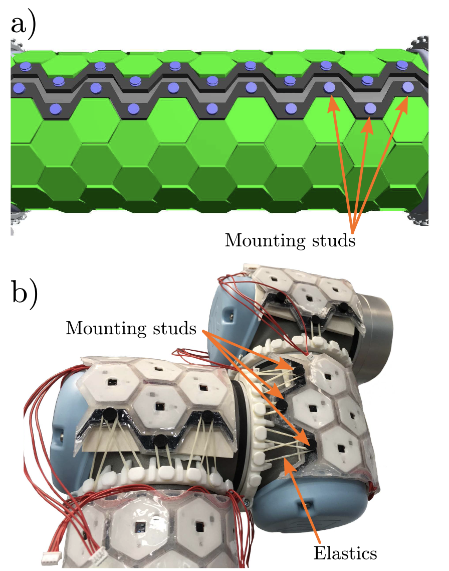 图7:机器人皮肤的固定机构。固定柱可实现皮肤贴片在机器人上的快速部署。(a)计算机辅助设计(CAD)图;(b)实际机器人上的安装效果
