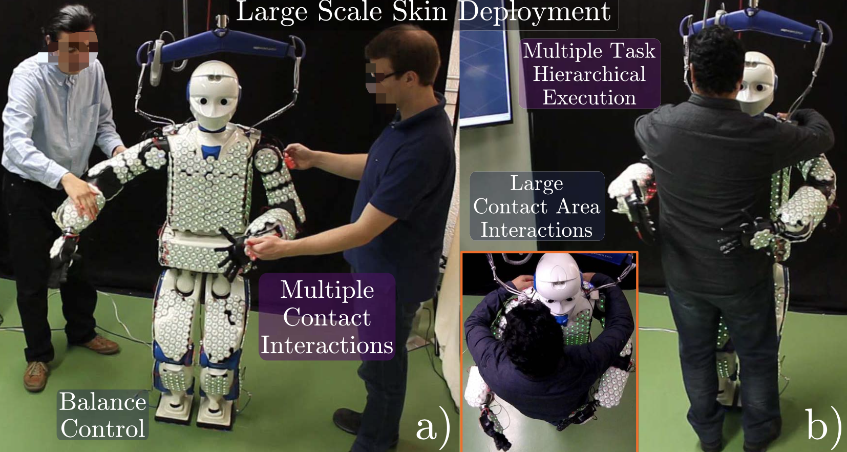 图15:(a)皮肤任务可应用于全身多接触点场景,并在平衡控制的零空间内执行。(b)通过皮肤柔顺任务的定义,支持大面积接触交互,且该方案具备可行性