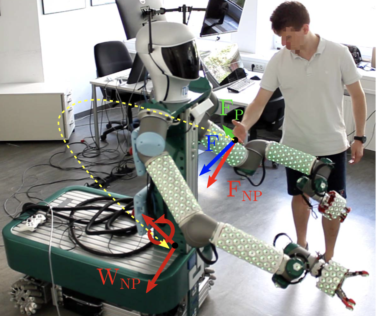 本节简要介绍一种控制策略,利用人造皮肤的力和接近度反馈增强双臂移动机器人的柔顺范围,该方法在文献中提出。机器人在人类环境中运行时,必须应对各种可能同时发生在任意接触点的物理交互。无论这些交互是期望的还是意外的,机器人都应产生安全且可预测的行为。因此,此类机器人必须具备全身柔顺性,即其整个身体都能保证柔顺性。