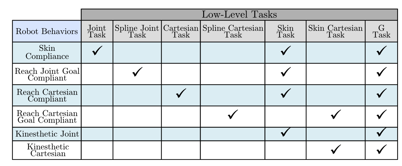 这是一种简单直接的任务控制输出融合方法,可生成复杂行为,例如将关节任务、重力补偿任务和皮肤任务融合,使非柔顺机器人具备柔顺行为。