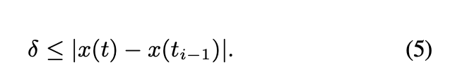 增量发送原理(SoDP):增量发送原理(SoDP)首次在文献中提出,是一种用于减少无线、电池供电、分布式传感器网络中传输量的高效概念。在这类场景中,减少传输量对于延长传感器寿命至关重要。SoDP的核心思想是:为在传感器层面实现冗余压缩,对现成传感器进行尽可能快的采样,但仅当当前采样值x(tk),tk = k Ts, k ∈ Z与上一次发送值x(tKi−1 ) 的差值超过预设固定阈值δ时,才在时刻tk=Ki发送该采样值: