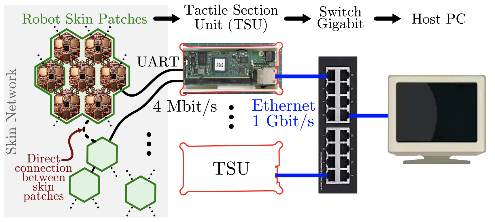 2. 机器人皮肤系统采用模块化皮肤单元设计,每个皮肤单元具备本地处理能力,并通过异步通信网络连接,无需专用硬件即可改造为事件驱动系统;