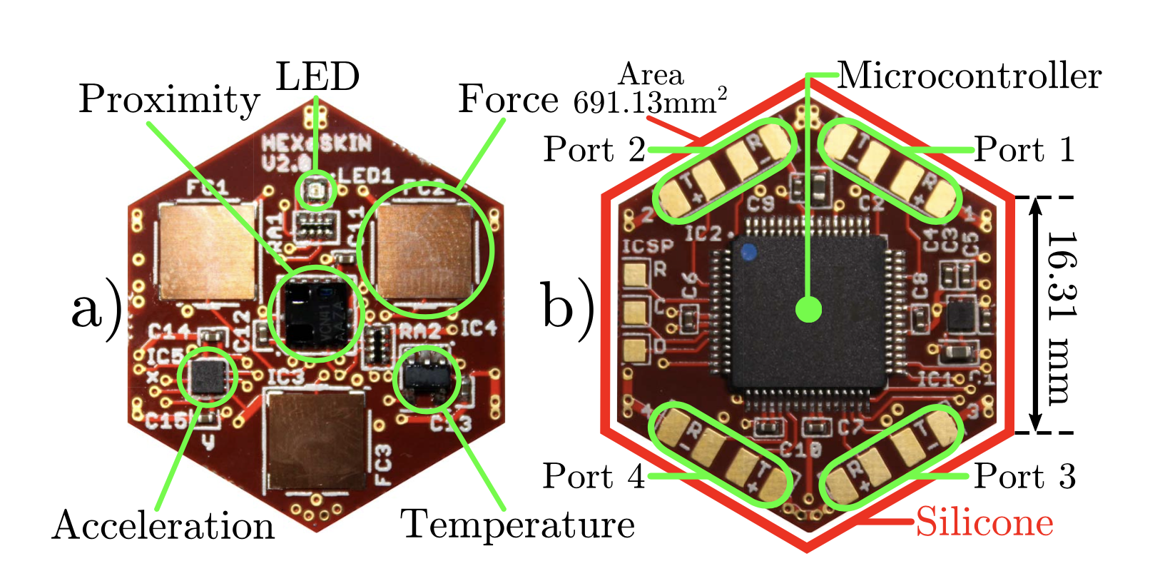 图2:慕尼黑工业大学认知系统研究所研发的机器人皮肤。(a)每个单元上搭载的传感器。(b)封装在硅酮材料中的单元电子设备,含微控制器及尺寸参数