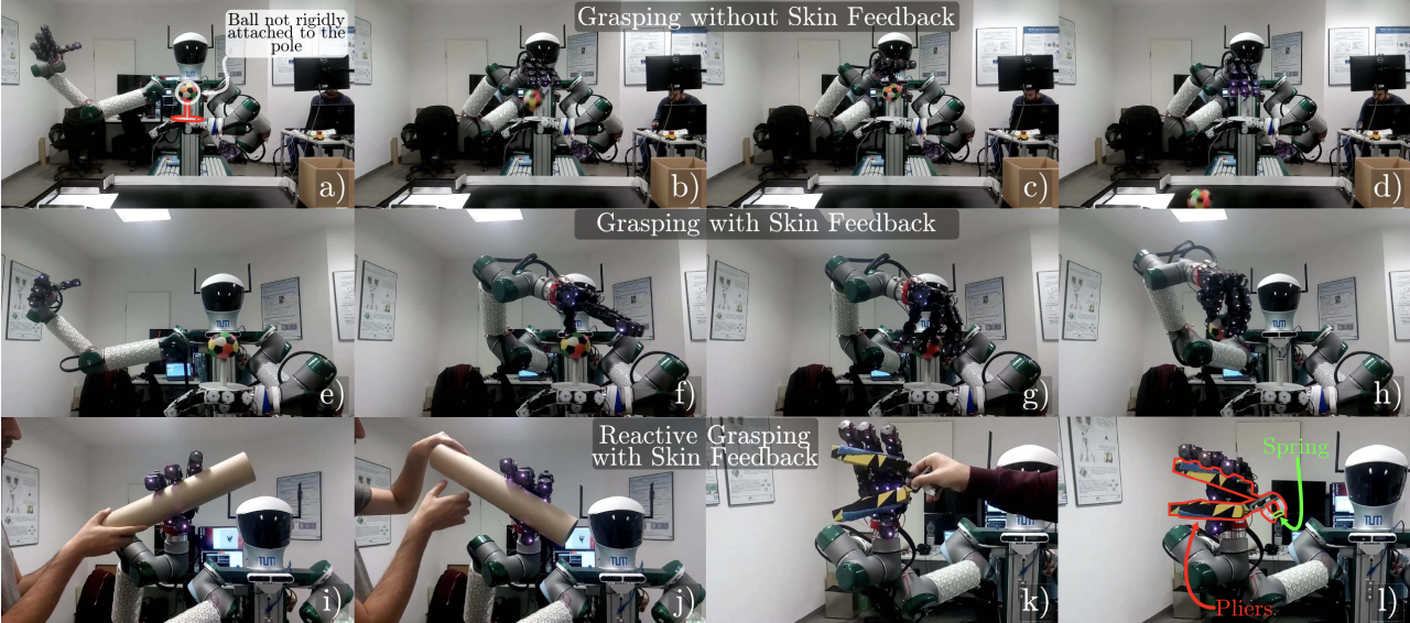 图13:基于多模态机器人皮肤信息的反应式抓取。(a)-(d)基于简单基元的全局抓取;(e)-(h)基于机器人皮肤的增强型反应式抓取;(i)-(l)面向多物体的反应式抓取及不同力分布的应用