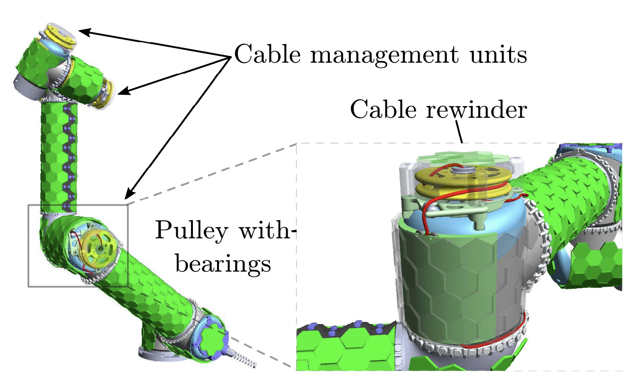 2. 线缆管理系统:为机器人覆盖大量皮肤单元时,线缆管理是主要问题之一。尽管最初考虑了无线通信方案,但由于带宽、延迟以及供电问题(每个皮肤贴片需配备独立能源),最终放弃了该方案。通常情况下,机器人的能源和控制信号线缆通过专用关节枢纽传输,以最大限度地减少机械干扰,提高整个系统的可靠性。然而,在许多情况下,这些线缆管道无法访问或不适合额外布线,因此只能将剩余线缆布置在机器人外部。虽然这在工业中较为常见(尤其是在机器人手臂与其末端执行器上的专用工具之间),但随着连接设备数量的增加或机器人任务复杂度的提高,这一方案会带来诸多问题。此外,对于机器人皮肤而言,线缆不能干扰测量设备(尤其是皮肤单元上的接近传感器),因此必须布置在皮肤单元网络下方,这大幅增加了线缆与机器人之间产生寄生机械相互作用的风险。实际应用中,我们通过线缆卷收器和滑轮系统解决了这些问题:线缆通过一组通道传输,通道末端配备滚珠轴承铰链以最小化摩擦;每个关节配备一个线缆卷轴,使线缆保持恒定且可调节的张力,从而避免对皮肤接近传感器产生不必要的干扰。适用于UR5机器人的完整线缆管理系统如图8所示。