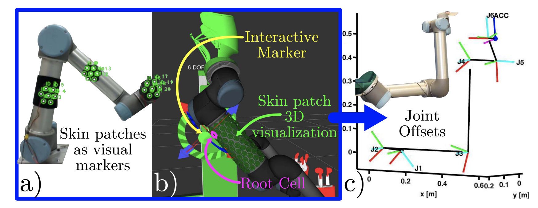 图5:(a)利用皮肤单元中嵌入的发光二极管(LED)将皮肤贴片转换为视觉标记,实现机器人皮肤贴片(根单元)在机器人身体坐标系中的定位(rTj)。(b)通过带有交互式标记的直观图形用户界面(GUI)手动定位皮肤贴片。(c)利用皮肤信息以及皮肤贴片到机器人身体坐标系的局部变换,可获取类D-H运动学参数