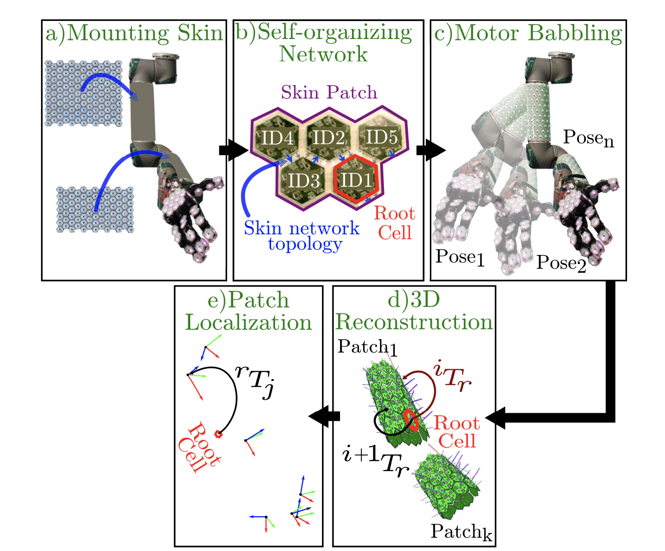 为在应用中充分发挥机器人皮肤的优势,需要将传感信息与空间信息相结合,例如对机器人上的皮肤传感器进行标记和定位。皮肤的配置与定位可实现自动化,例如结合自触摸与RGB-D信息。本文中,我们开发了一种自配置/自定位方法,其主要步骤如图4所示:1)将皮肤贴片安装在机器人肢体上;2)探索皮肤传感器网络以提取其拓扑结构;3)通过电机试探(motor babbling)获取不同姿态下的皮肤单元数据;4)三维表面重建;5)确定皮肤贴片相对于其安装肢体的位置。