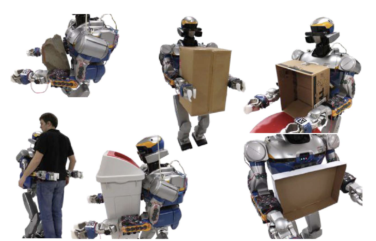 文献报道了用于类人机器人抓取大型物体的全身抓取方法(见图14)。该方法在HRP-2机器人上实现,用于抓取大型未知物体。实验中,共使用74个皮肤单元:胸部覆盖12个,两条手臂内侧各覆盖31个(总计62个)。我们采用类人策略,类似于人类用双臂将大型未知物体拉向胸部。该策略具有以下优势:三个远端接触点可形成稳定抓取;大面积柔顺接触区域可分散施加的力并提供剪切稳定性;物体重量可靠近机器人质心;短运动链可降低所需的关节力。为利用人造皮肤系统在HRP-2机器人上快速复现这种人类行为,我们首先示教机器人双臂的抓取和拉动轨迹,然后定义接触区域(主要在胸部和两条手臂内侧)并允许在该区域内施加力,采用触觉事件驱动状态机(打开、闭合、拉动、复位)协调抓取序列,并利用触觉反应和感觉-运动映射(见第四部分1小节)使抓取轨迹适应物体尺寸。
