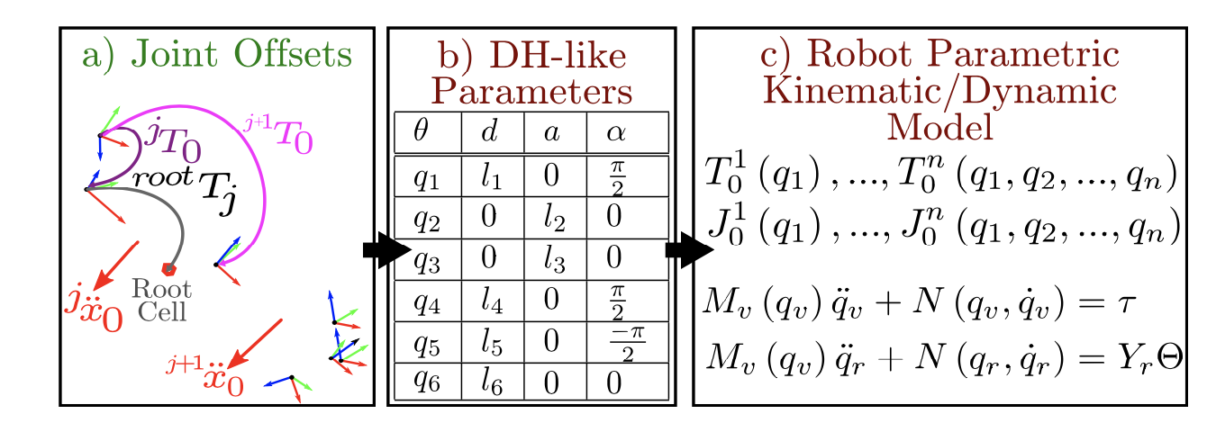 图6: 参数化运动学与动力学建模。(a)皮肤贴片的自获取运动学信息可用于获取机器人运动学参数。这些参数可表示为(b)类D-H参数,而类D-H参数进而可用于构建(c)机器人解析模型