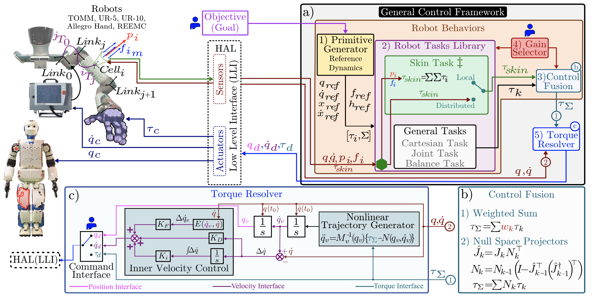皮肤控制:几十年来,触觉感知及其在机器人控制中的潜在应用一直受到关注。为此,研究人员提出了多种技术和方法来检测机器人身体(不仅是末端执行器)上的接触。例如,文献的触觉传感器用于检测物理接触并计算身体反应。此外,为防止机器人与环境发生碰撞,预接触检测技术也得到了研究。这些物理交互的实现通常需要集成力矩传感器来测量交互力。