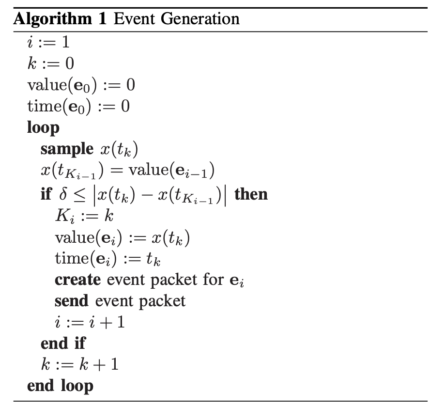 即事件数据包包含触发事件的传感器值x(tKi )和事件发生时间tKi (见算法1)。因此,将异步事件数据包转换回同步信息流以进行同步处理时不会产生漂移,且不受事件丢失的影响。然而,基于SoDP和事件数据包的事件驱动系统的时间精度低于采用模拟事件生成器和 AER 的事件驱动系统,其时间精度受传感器采样率和事件数据包传输层时间精度的限制。