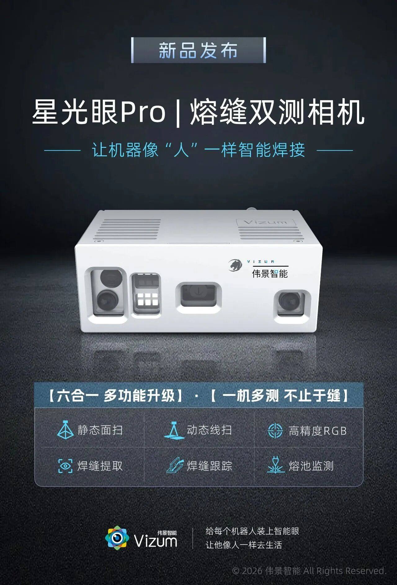 2月26日,伟景机器人重磅推出星光眼Pro-熔缝双测相机。该产品面向具身智能焊接机器人应用,定位为焊接程的核心多维度智能传感器,用于在复杂工况下提供稳定、可用的焊接视觉支撑,推动智能焊接与免示教焊接向工程化落地迈进。