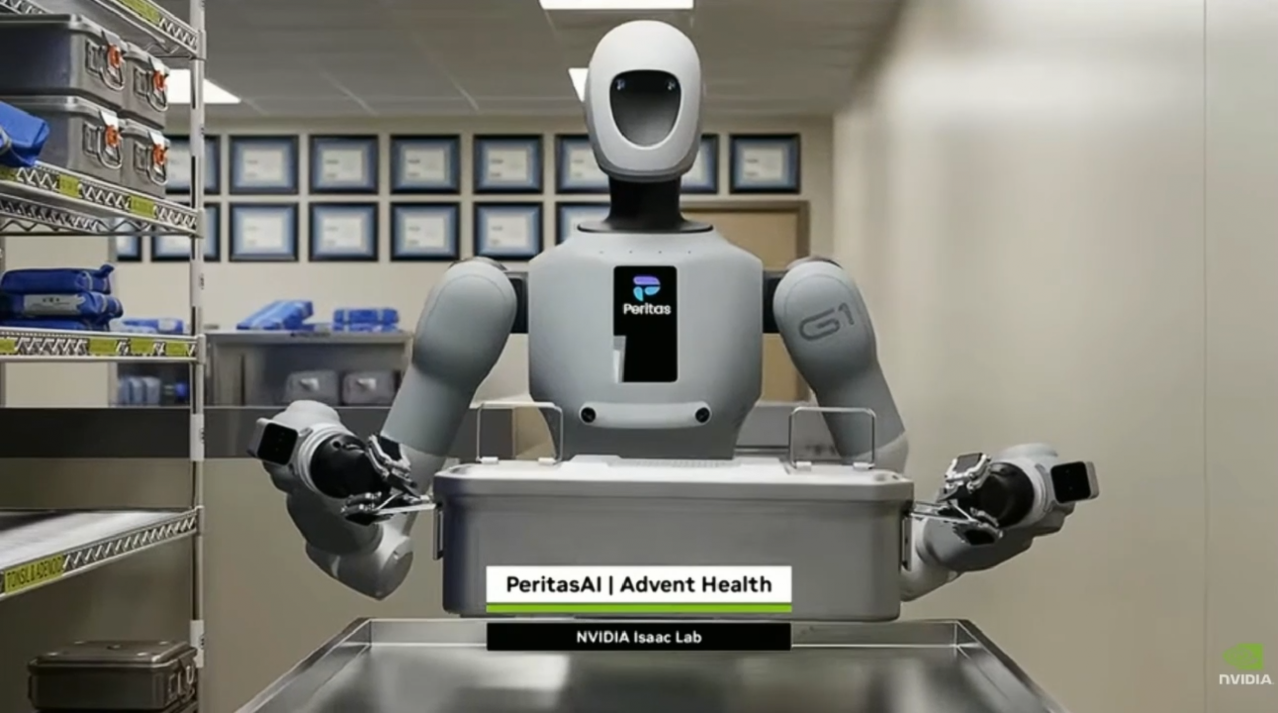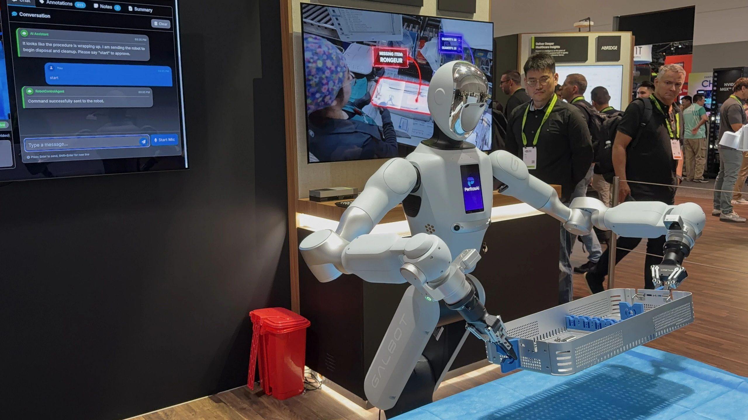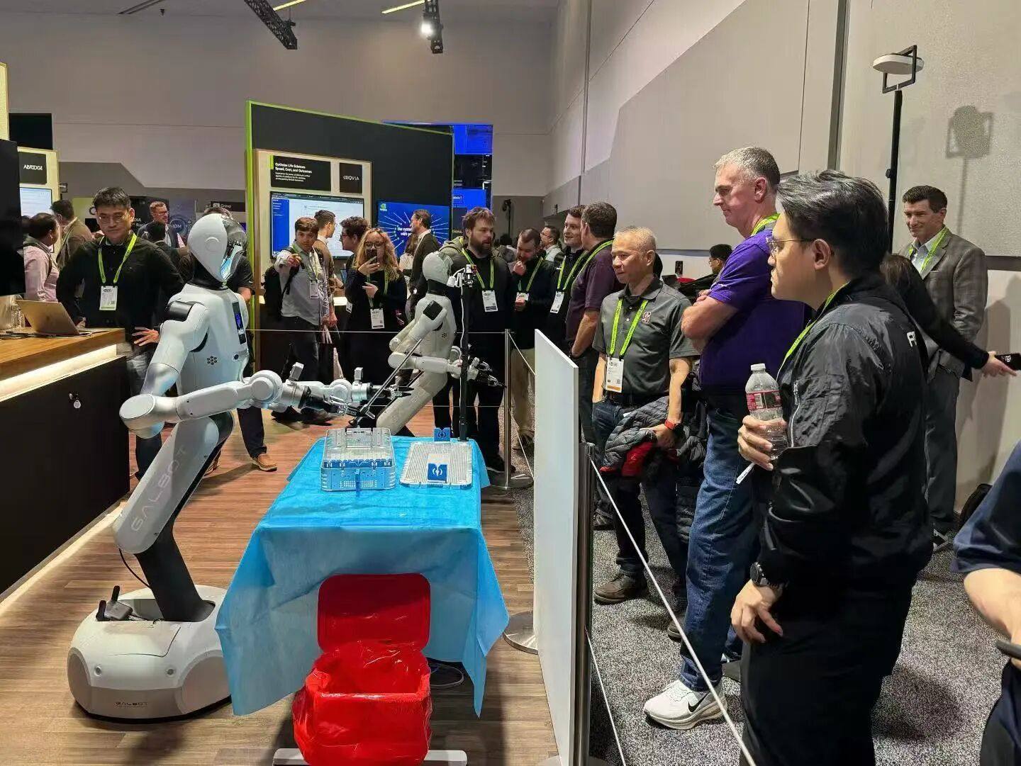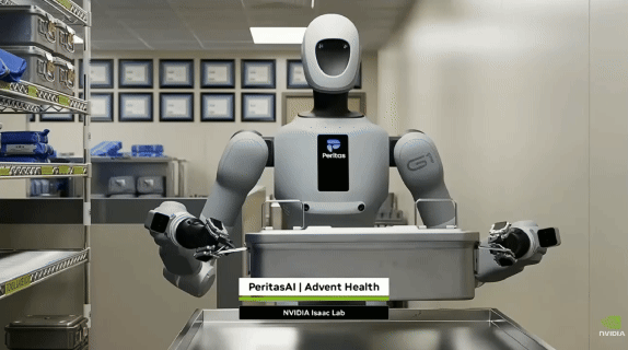 值得一提的是,PeritasAI 还在其 GTC 展位现场进行了 Galbot 真机操作展示,该方案由银河通用与英伟达共同打造,来源于 PeritasAI 真实医疗场景需求,直观呈现出机器人在真实环境中的连续作业表现。