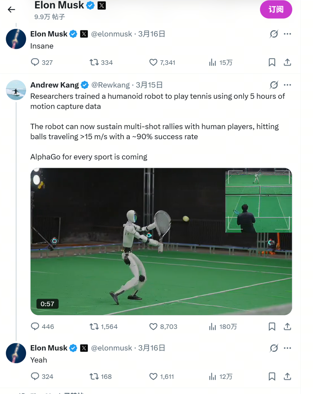 银河通用机器人在“盘核桃”“打网球”等高难度技能展示后不仅吸引马斯克第一时间关注并回复;