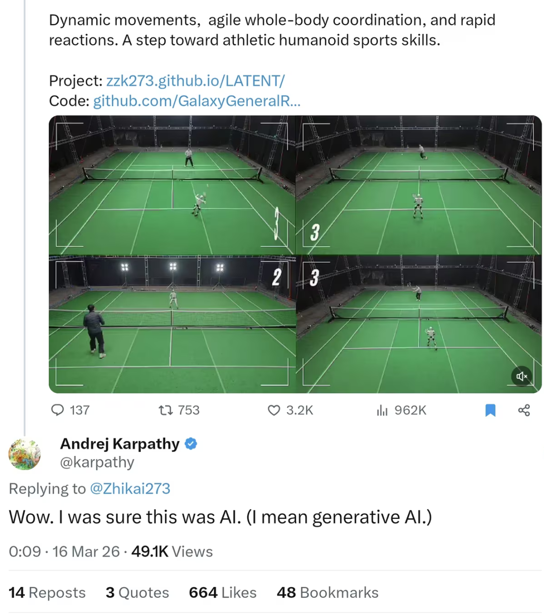 由于其动作流畅度与泛化能力远超行业预期,甚至一度引发美国知名 AI 研究人员及社区对视频真实性的讨论与质疑——原特斯拉人工智能和自动驾驶部门(Autopilot)负责人 Andrej Karpathy 就发推认为其表现或为 AI 生成。