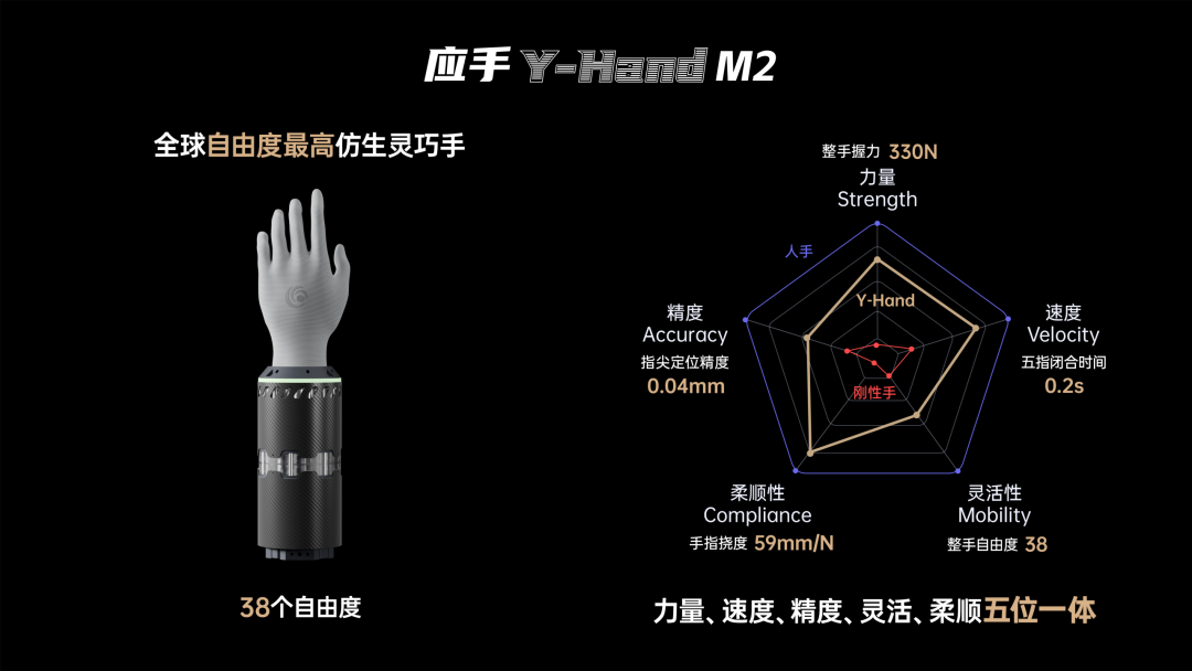在性能指标上,Y-Hand M2实现 “力量、速度、精度、柔顺、灵活” 五位一体跃迁: