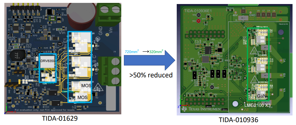 为了在设计中比较 GaN 和 MOSFET,我们可以查看提供类似功率级别的 TIDA-010936 和 TIDA-01629 设计。如上图所示,由于集成了栅极驱动器并降低了 GaN 的 RSP,整个功率器件的芯片面积减小了 50% 以上。