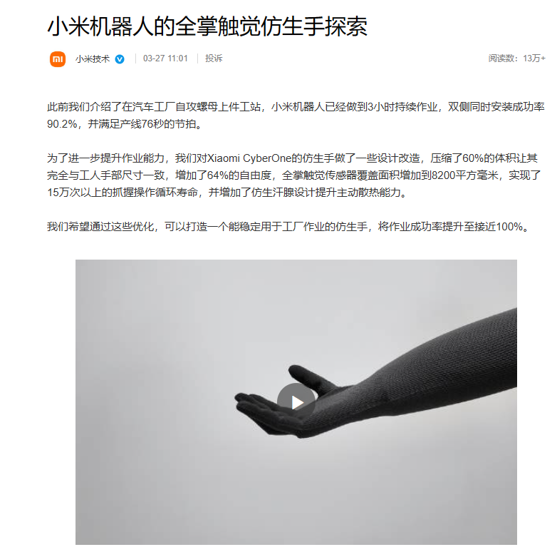 小米在仿生手触觉感知、结构优化及系统可靠性等关键技术上的持续突破,为机器人精细化操作能力与商业化应用落地提供了坚实支撑,推动具身智能加速迈向产业化阶段。