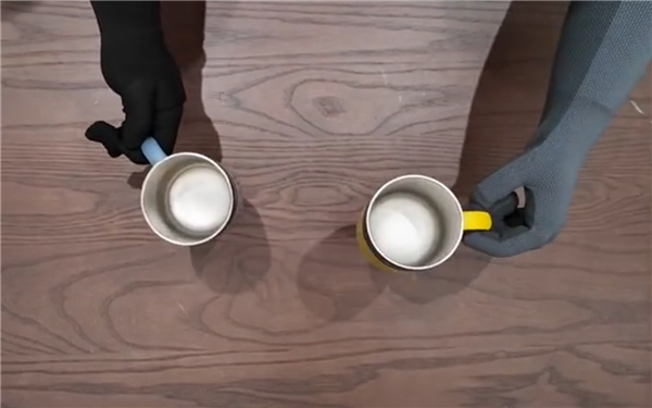 实验显示,在相同操作任务下,人手与仿生手(通过遥操作)穿戴触觉手套后,能够获取相近的触觉数据,为后续算法训练提供支持。