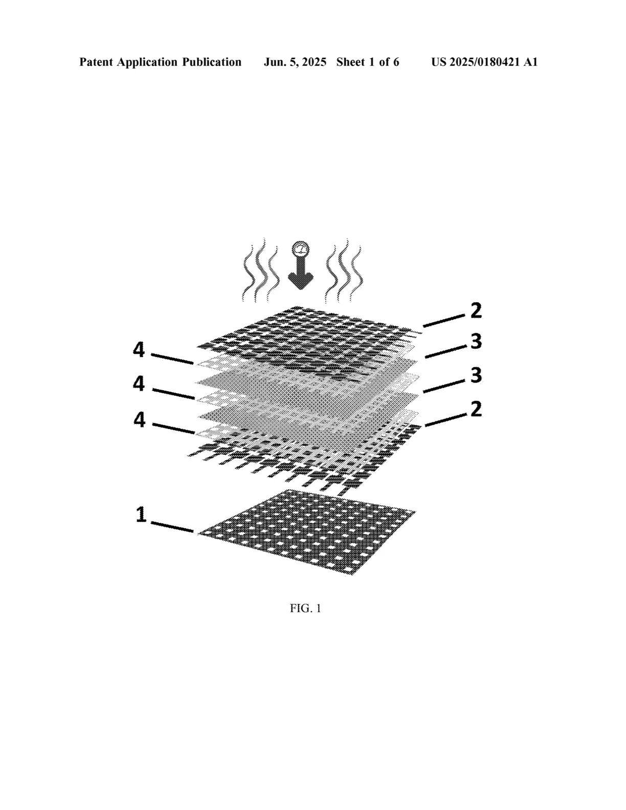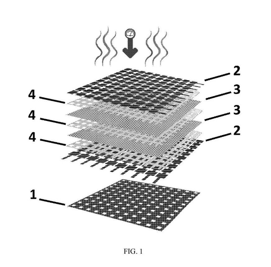 [0052] 设计的新型压力板(1)带有孔洞,负责形成气隙。压力板(1)决定了在施加热量的过程中,哪些区域需要与双面热熔黏合衬布层(4)接触。压力板(1)的孔位与预期的压力传感阵列单元的尺寸一致,因此可精确控制气隙的位置和尺寸。