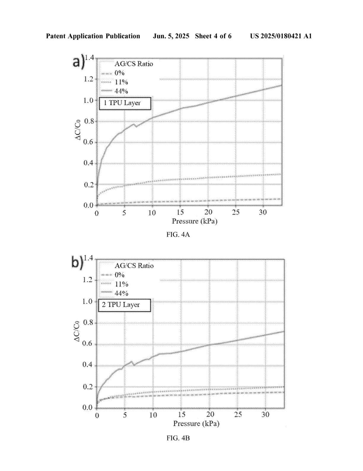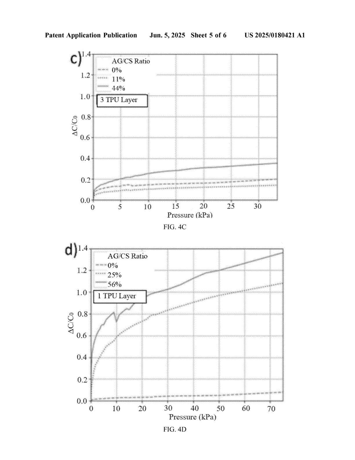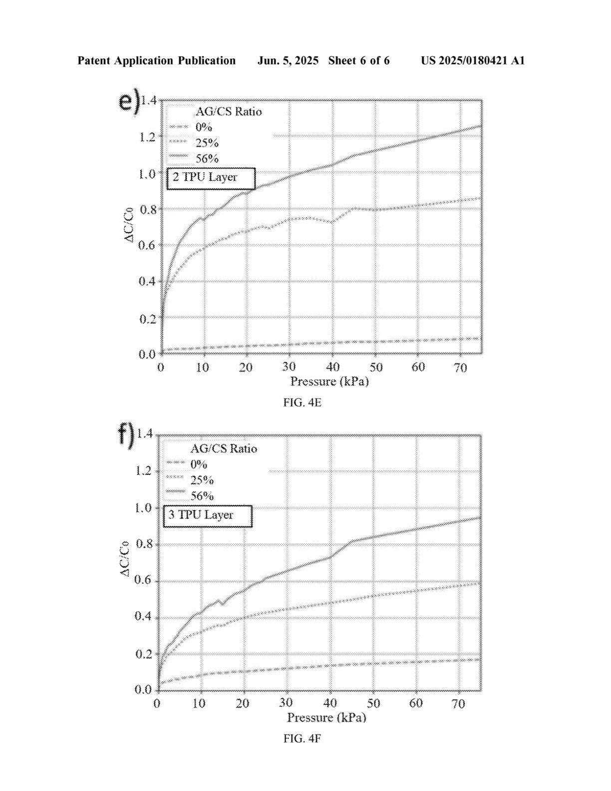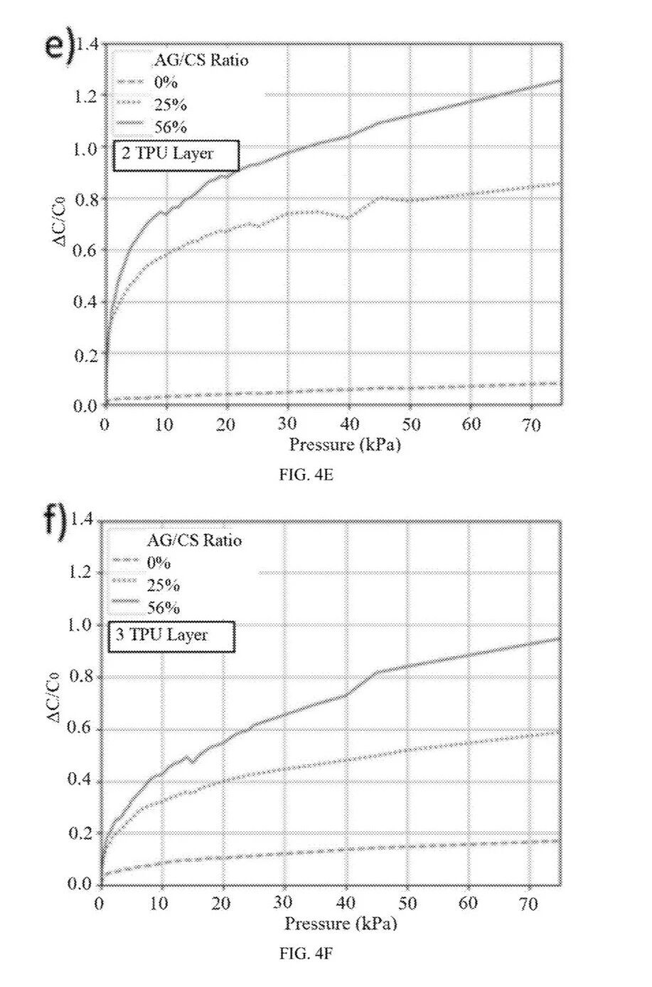 [0049] 图 4A–4C 展示了 15×15 mm² 传感单元在不同热塑性聚氨酯薄膜层数下的灵敏度曲线;图 4D–4F 展示了 10×10 mm² 传感单元在不同 TPU 层数下的灵敏度曲线。可以看到,随着 TPU 层数增加,灵敏度也随之提高,而 10×10 mm² 传感单元由于气隙/单元面积比更大,其最大灵敏度可比 15×15 mm² 单元高出 15 倍。