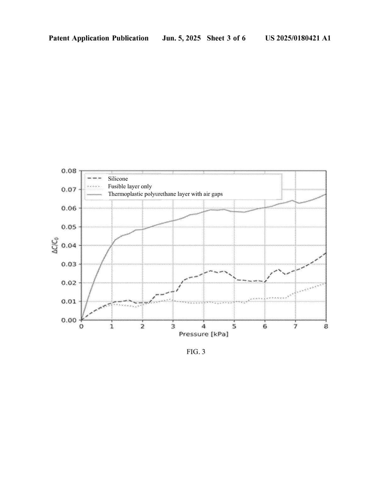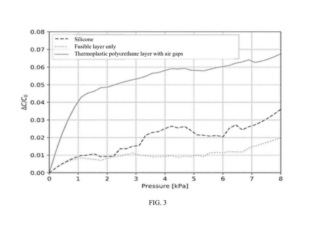 [0035] 图 3:显示传感阵列在仅使用硅橡胶层、仅使用热熔黏合衬布层以及仅使用热塑性聚氨酯(TPU)空气隙层时,其压力灵敏度对比的图;