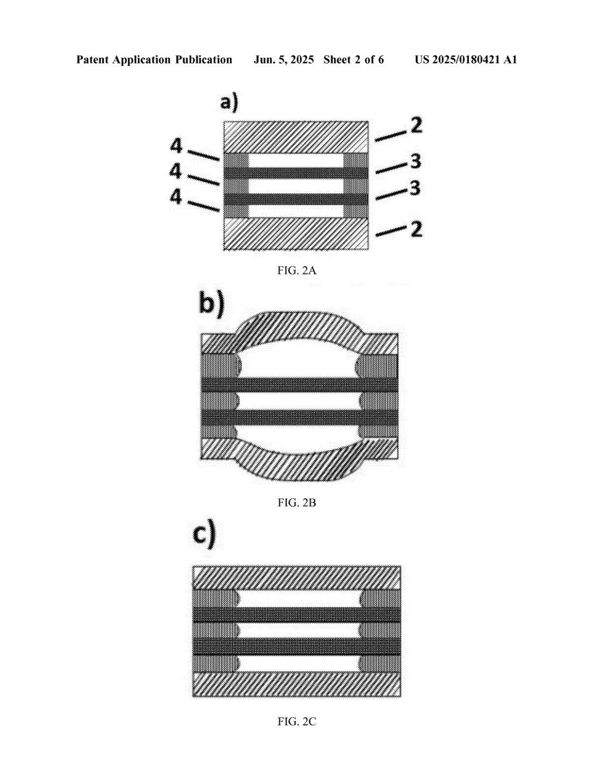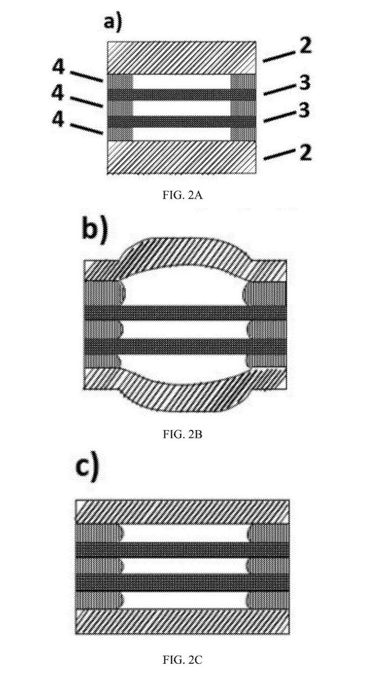 [0033] 图 2B:在施加热和压力之后,基于纺织物的大面积压力传感阵列的截面图,其中尚未安装新的压力板;