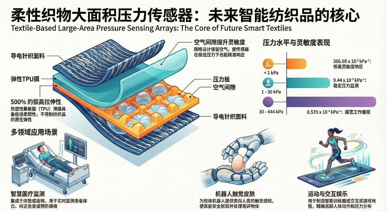 具有柔韧性和弹性伸长性能的导电针织织物层,其位于基于纺织物的大面积压力传感阵列的上下两面,当施加小电压时在压力板上产生电场;