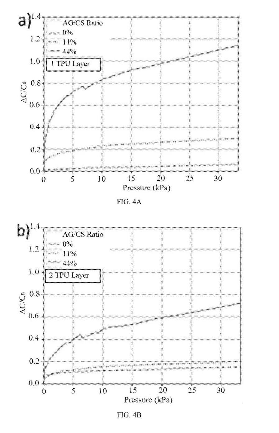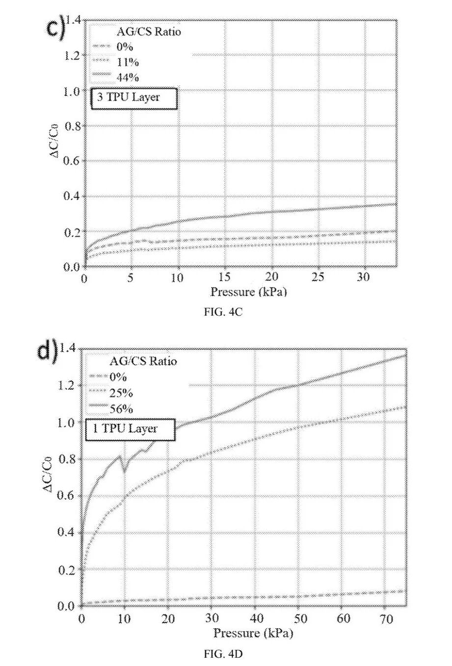 [0014] 部分压力传感器产品中的电极–导电层可以通过丝网印刷或喷墨印刷形成。在其他产品中,则是在作为介电材料的硅弹性体层之间压入导电织物。以下给出三个示例: