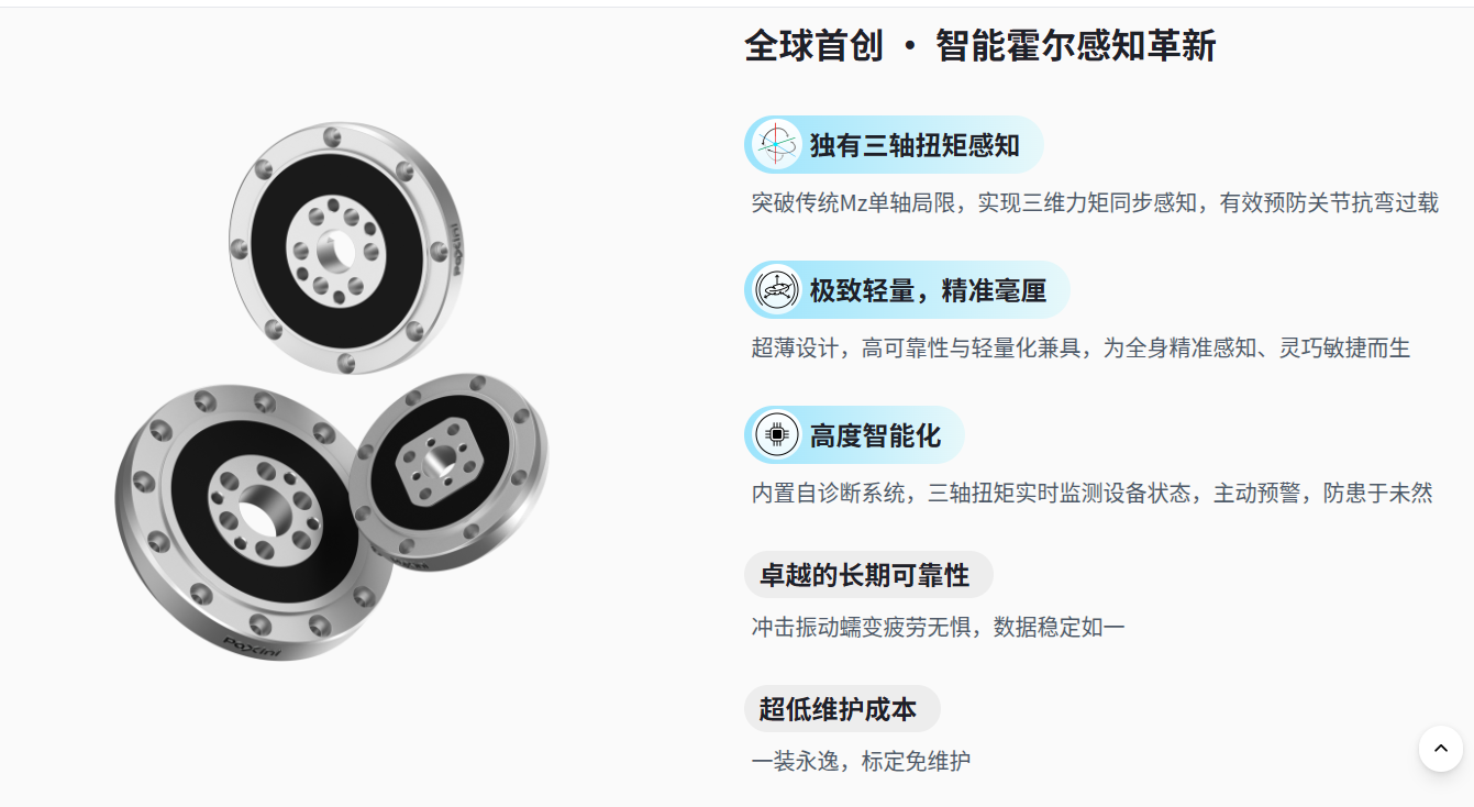 在性能表现方面,PX3Q支持多维力矩检测,分辨率可达0.1%FS,综合误差低至0.5%FS,同时具备超载保护能力,可在复杂工况下实现稳定、精准的力矩感知。产品采用磁环式霍尔感知方案,具备响应快、结构紧凑等特点,能够为机器人系统提供高质量的力交互数据支撑。