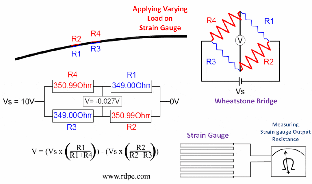 惠斯通电桥的作用是将应变片极微小的电阻变化(ΔR)转化为易于测量的电压信号(Vout)。