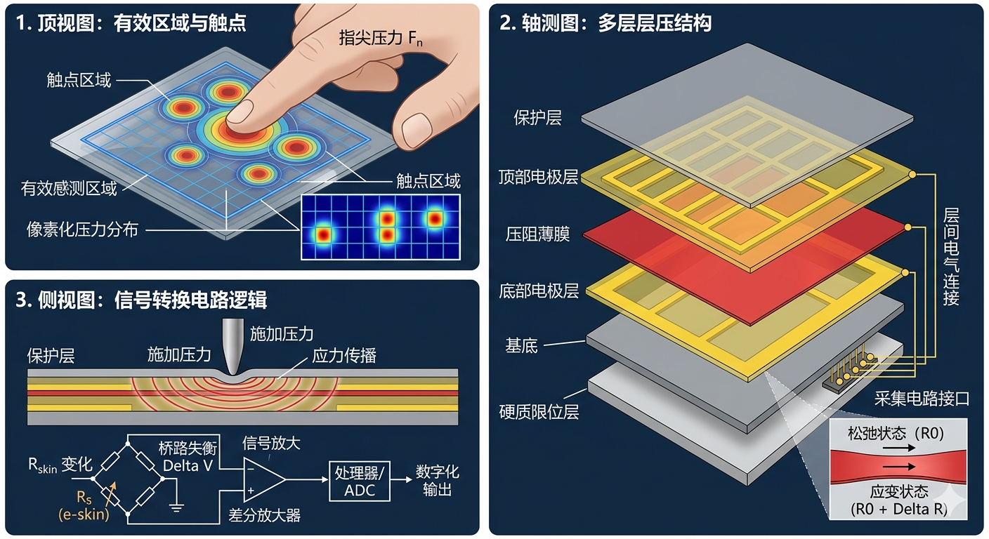 有效感测区域的几何设计。有效感测区域通常采用蛇形排布: ① 设计精要:蛇形布线能在有限的“像素点”内极大增加导线总长度。根据压阻原理,长度越长,形变产生的电阻变化越明显,从而显著提升了信噪比。 ② 阵列式结构:矩阵化布局是实现“全场感知”的关键。通过拨号点寻址技术,系统可以像扫描屏幕像素一样获取压力热力图。 -