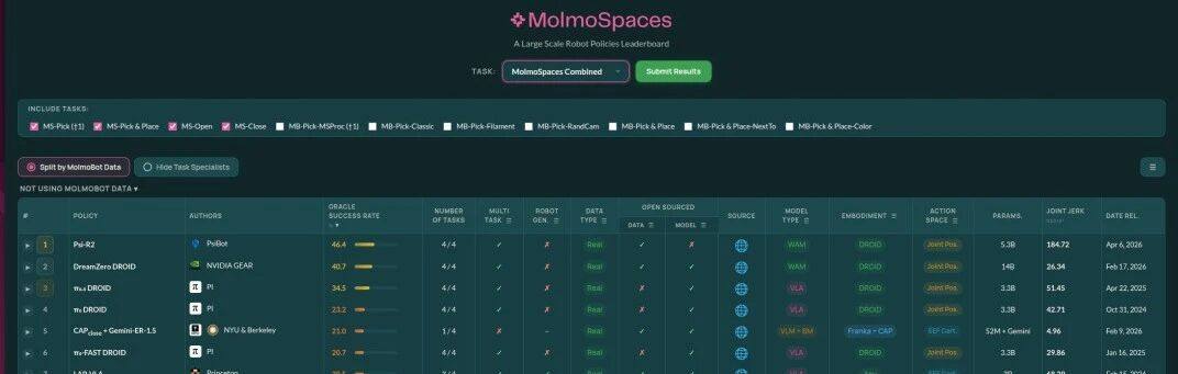 在 MolmoSpace 国际具身智能基准评测中,Psi-R2 超越 PI 与英伟达的模型,斩获全球第一。