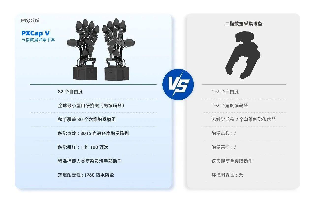 82自由度五指动作数据:依托自研穿戴设备 PXCap V,内置30个六维触觉模组、3015个触觉点,可同步采集15种维度的触觉信息及手部姿态、关节运动,实现对人类真实操作过程的高精度还原。