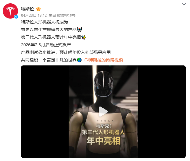 ● 特斯拉官方:第三代人形机器人预计年中亮相,7-8月启动正式投产
